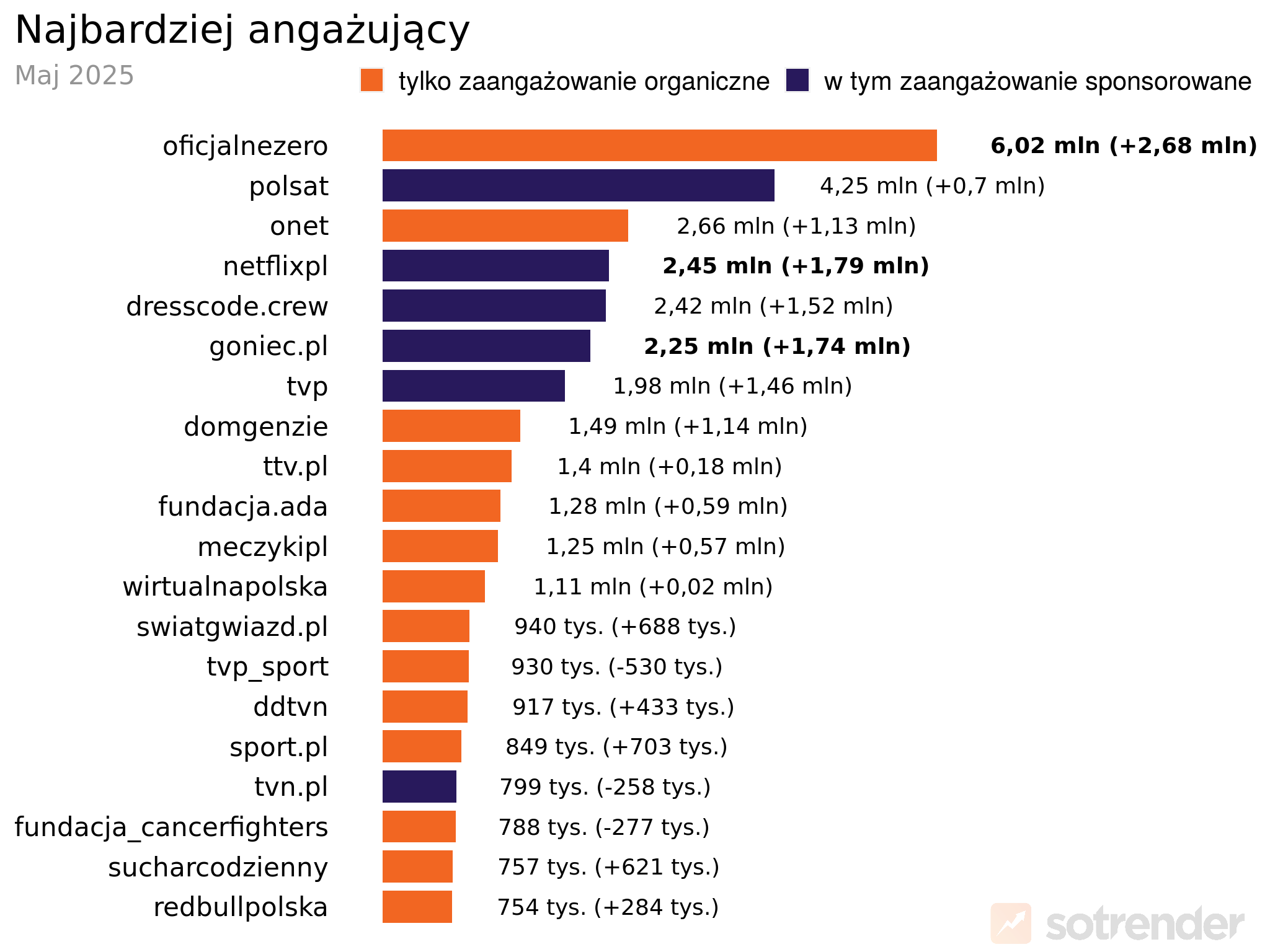 W maju to OficjalneZero zgarnęło tytuł najbardziej angażującego profilu – zebrało aż 6,02 mln interakcji. Co ważne: cały wynik pochodził z działań organicznych. W porównaniu do kwietnia oznacza to wzrost aż o 2,68 mln.