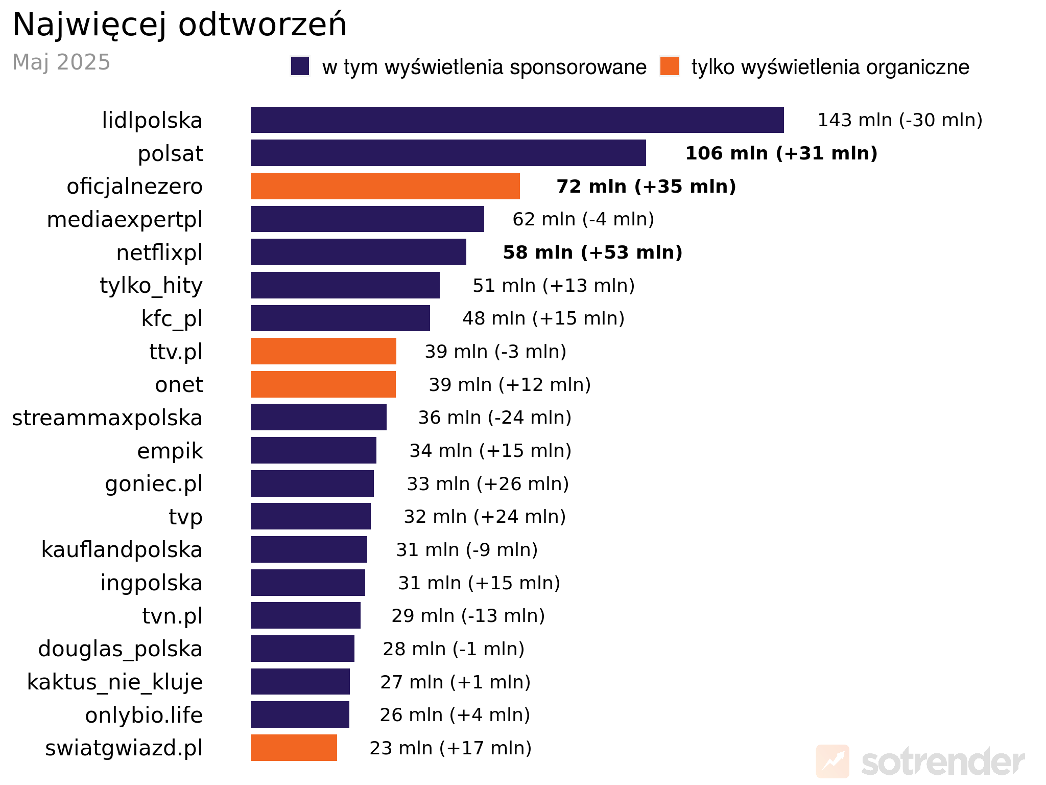 Lidl Polska nadal dominuje pod względem wyświetleń – zanotował ich 143 mln. To wciąż bardzo mocny wynik, choć o 30 mln niższy niż w kwietniu. Polsat z kolei zwiększył swój wynik o 31 mln i łącznie osiągnął 106 mln wyświetleń, co mocno zbliżyło go do lidera. Oba profile publikowały treści sponsorowane, ale warto zauważyć, że w przypadku Polsatu był to tylko jeden post.