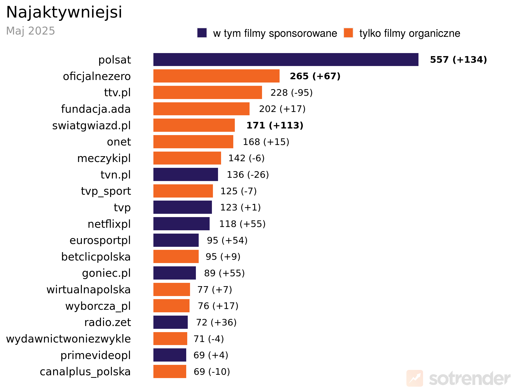 Na drugie miejsce awansowało OficjalneZero, które opublikowało 265 filmów. Trzecie miejsce zajęło @ttv.pl z 228 postami, mimo że w porównaniu z kwietniem zmniejszyło swoją aktywność.