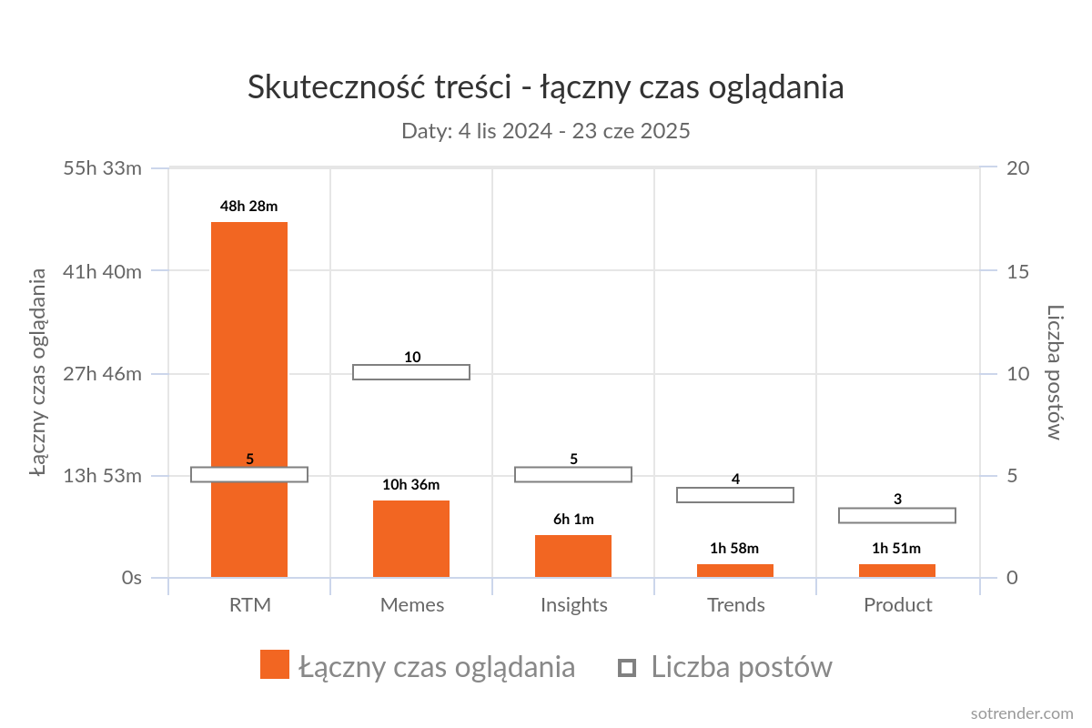 Funkcją, której nie znajdziesz w innych narzędziach do analizy TikToka jest Skuteczność treści. Dzięki niej zrozumiesz, które linie komunikacyjne, a nie pojedyncze posty, najlepiej sprawdzają się np. do budowania zasięgów lub zaangażowania.