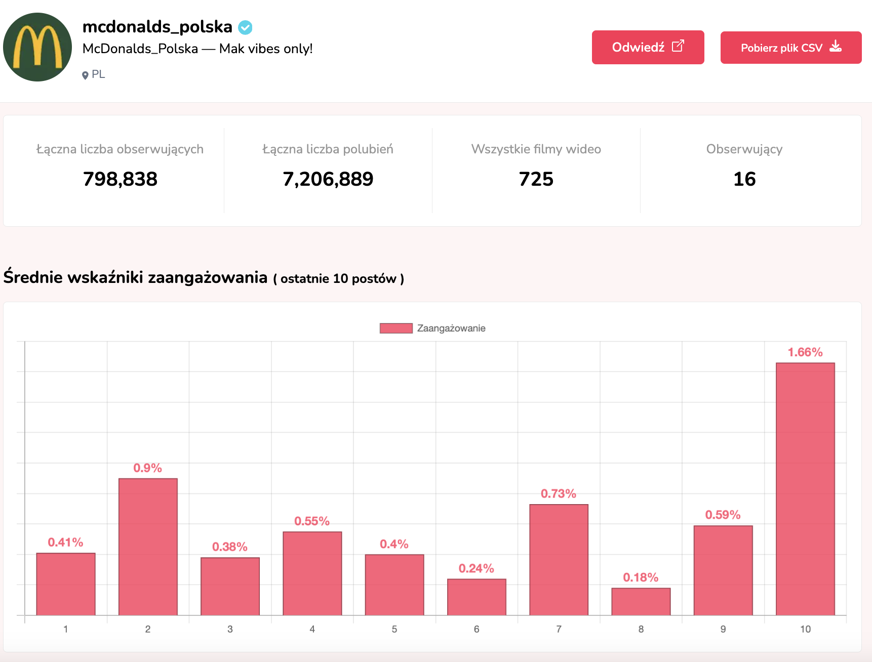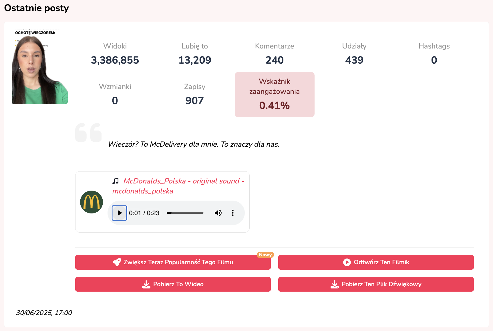 Dostępne jest także zestawienie kilkunastu ostatnio opublikowanych postów (choć bez możliwości ich sortowania i filtrowania) wraz z podstawowymi wskaźnikami takimi jak liczba polubień i komentarzy, liczba wyświetleń, liczba zapisań czy wskaźnik zaangażowania.