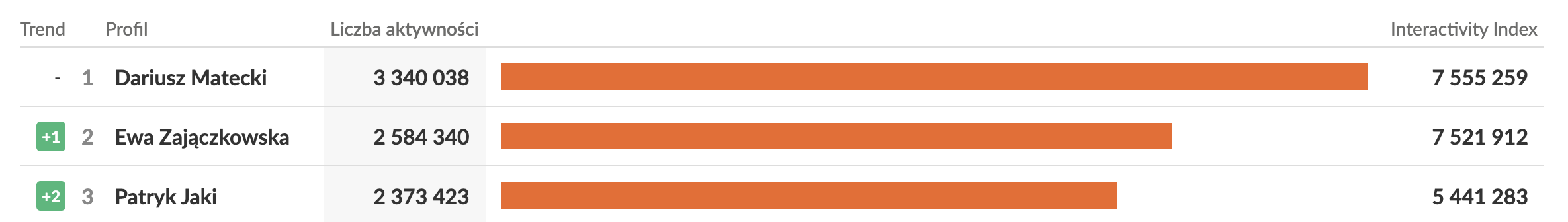 Politykiem z największym zaangażowaniem pozostał kolejny miesiąc z rzędu Dariusz Matecki. Jak widać na polskim Facebooku rządzi prawica, i nawet czołowym polskim sportowcom daleko jest do zaangażowania, jakie generuje Matecki, Zajączkowska czy Jaki.